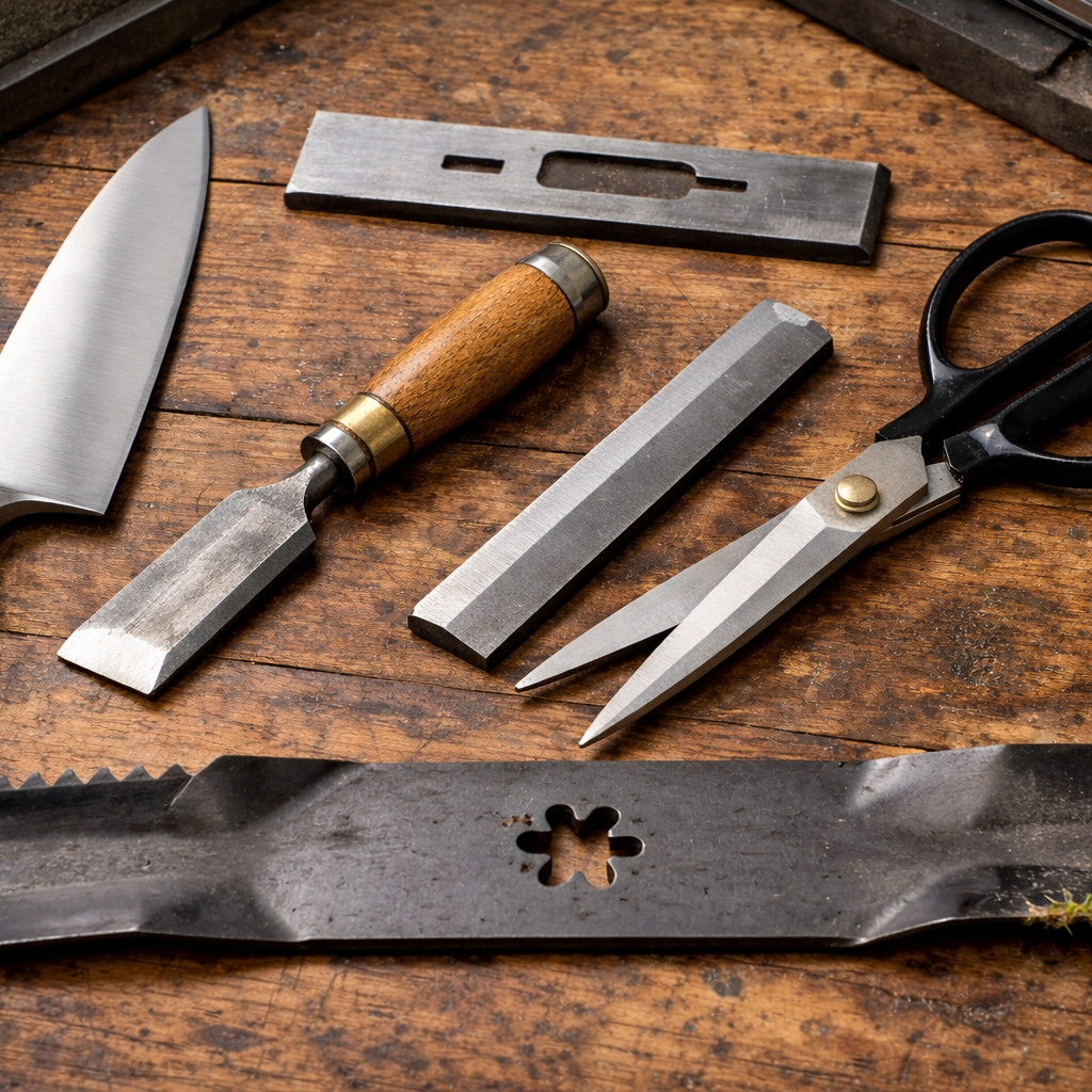 Sharpening services for knives, axes, clippers, machetes, and lawn mower blades tailored to each tool.