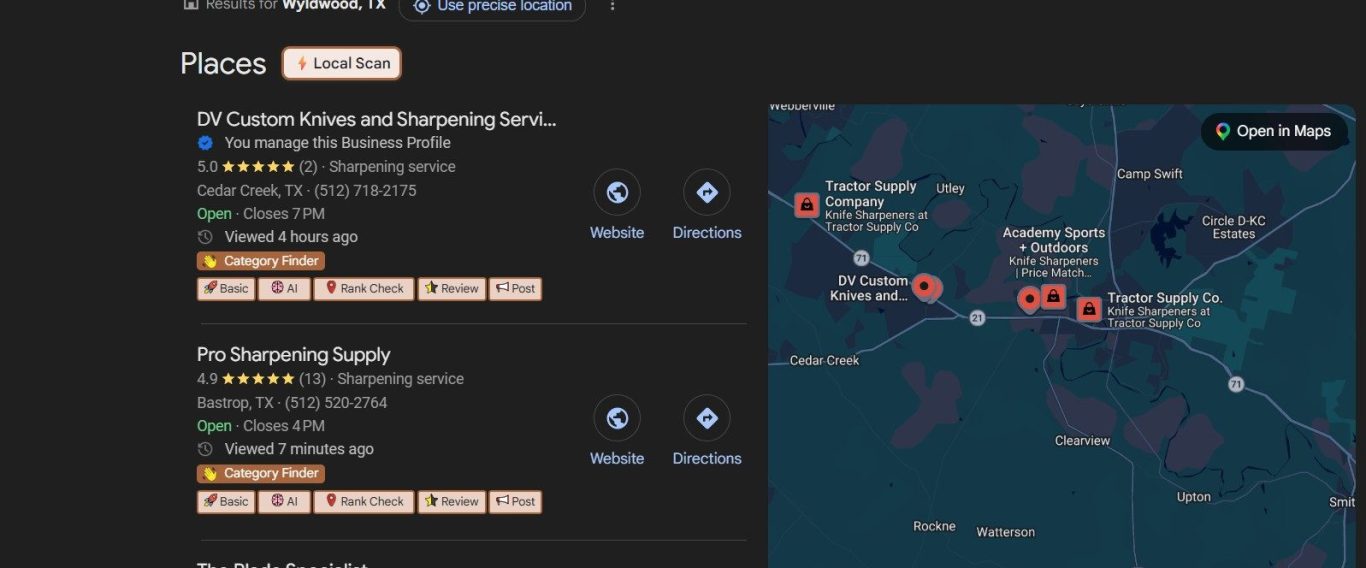 Our in-person customers mainly come from Bastrop, Cedar Creek, Wyldwood, Garfield and surrounding areas however, we also have customers from further away that choose to mail in their knives for sharpening.